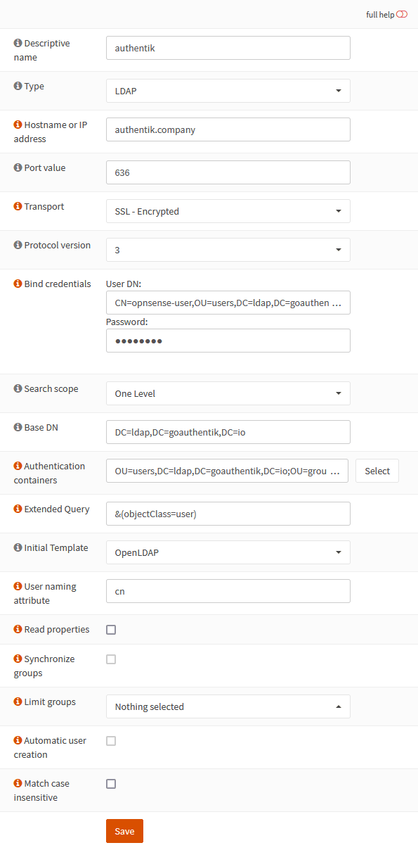 authentik.companyis the FQDN of authentik.opnsenseis the name of the authentik Service account we'll create.DC=ldap,DC=goauthentik,DC=iois the Base DN of the LDAP Provider (default)